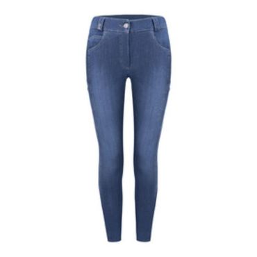 Reitjeans in angesagtem Denim, lässig vorgewaschen normaler Bund bei mittlerer Leibhöhe sorgt für den perfekten Sitz Gürtelschlaufe in hinterer Mitte mit Kristall¬niete durch besondere Schnittkontruktion keine störende Teilungsnaht am Knie trendiger Nahtverlauf mit zwei integrierten Handytaschen Cavallo Logo aus edel funkelnden Kristallen Besonderer Fokus liegt auf dem Stoff: Er wurde überwiegend nachhaltig aus recycel¬tem Polyester und Baumwolle hergestellt