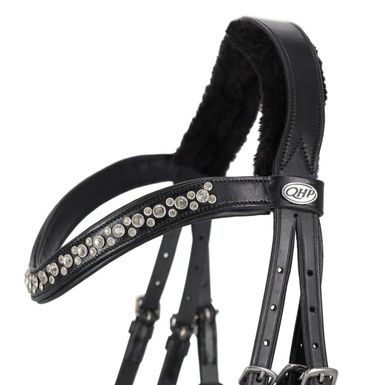 Diese anatomisch geformte Trense ist an Nasenriemen, Genickstück und Schnalle mit einer abnehmbaren, waschbaren Kunstfellunterlage gefüttert. Der speziell geformte Nasenriemen und das leicht ausgeschnittene Genickstück lassen empfindliche Teile des Pferdekopfs frei. Mit wellenförmigem Stirnriemen, beidseitig verstellbarem Kehlriemen und weicher Unterlage unter Stirn- und Sperrriemen.