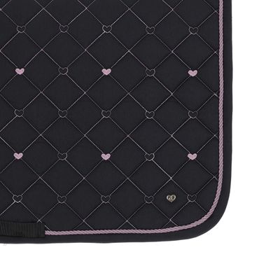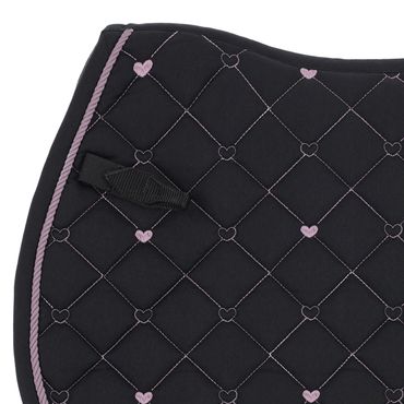 Die Schabracke Lize hat ein bezauberndes aufgesticktes Herzchenmuster und eine elegante Zierkordel. Ein weiteres schönes Detail ist der herzförmige Q-Pin auf der linken Seite. Die Schabracke ist mit absorbierendem Mesh-Material unterlegt, das dein Pony beim Reiten kühl und trocken hält. Darüber hinaus hat sie kurze D-Ring-Schlaufen und Gurtschlaufen mit Klettband.