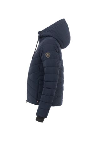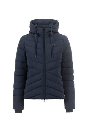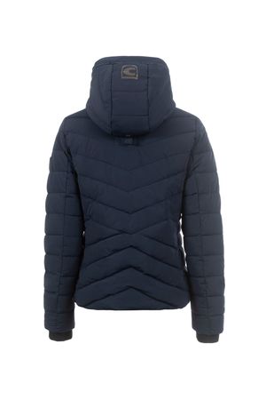 Kurze, taillierte Steppjacke mit Kapuze und mit Füllung aus Fake-Daune. Spannendes Steppmuster vorne und hinten sowie eine horizontale Steppung an den Seiten und an den Ärmeln. Tonig bedruckte Bänder am Kapuzenrand. Kapuze ist mit einem Druckknopf am Rück