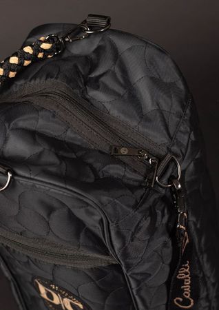 Stiefeltasche mit Allover-Steppung, Denici Cavalli-Logo mit Kristallen, Außentasche mit Reißverschluss, bequemem Tragegriff in Schwarz/Beige, verstellbarem Schultergurt mit Denici Cavalli-Schriftzug, Stofftrennwand im Inneren und Kunststoffnoppen am Taschenboden.