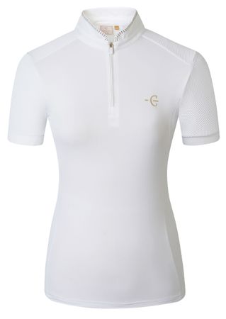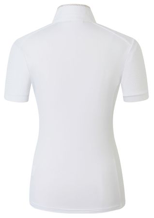 Unser Competition Shirt kombiniert sportliche Performance mit stilvollem Design. Das atmungsaktive, elastische Material sorgt für besten Tragekomfort und maximale Bewegungsfreiheit im Sattel.|Der taillierte Schnitt betont die Figur, während der elegante Stehkragen mit dezenten Glitzerapplikationen einen Hauch von Glamour verleiht.