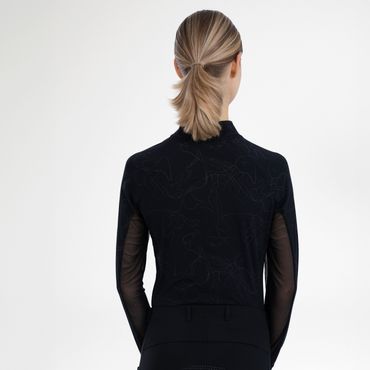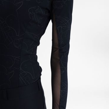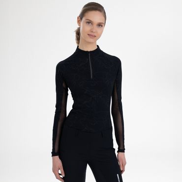Dieses langärmelige Shirt besticht nicht nur durch seinen durchgängigen All-Over-Print, der dich im Sattel oder im Stall immer top-modisch aussehen lässt. Es bietet dir auch essenziellen Schutz mit integriertem UV40+ Sonnenschutz, damit du dich voll und ganz auf dein Training konzentrieren kannst, ohne dir Sorgen um die Sonne machen zu müssen. Der praktische Half-Zip mit Stehkragen ermöglicht dir individuelle Belüftung und einen eleganten Look. Die raffinierten Mesh-Einsätze unter den Achseln und an den Ärmelunterseiten sorgen für optimale Luftzirkulation und halten dich auch bei intensiven Rides angenehm kühl. Abgerundet wird das Design durch das funkelnde Strass-Pferdekopf-Logo am linken Kragen und den edlen "EUROSTAR"-Gummidruck am rechten Ärmel – kleine Details, die Exklusivität und deine Liebe zum Pferdesport unterstreichen.