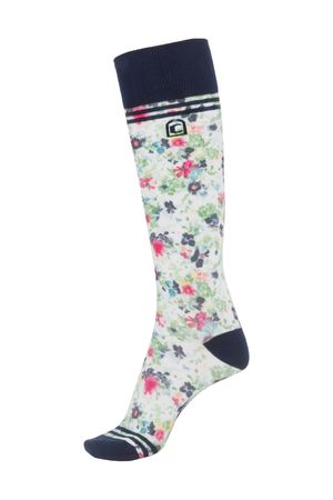 Damen Funktionsstrumpf. Extra dünner Schaft, der im Stiefel nicht aufträgt. Mit einem Allover floralen Muster. Cavallo-Steigbügel in Dunkelblau oben am Schaft. Ferse, Fußspitze und Schaftabschluss ebenfalls in Dunkelblau gehalten. R/L Kennzeichnung.