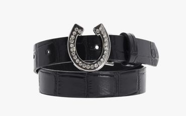 Die Schnalle des Gürtels Lize aus der Winterkollektion ist mit einem Hufeisen verziert, das mit Strasssteinchen besetzt ist. Der Gürtel hat eine Reliefprägung und wird mit einer Dornschnalle geschlossen.